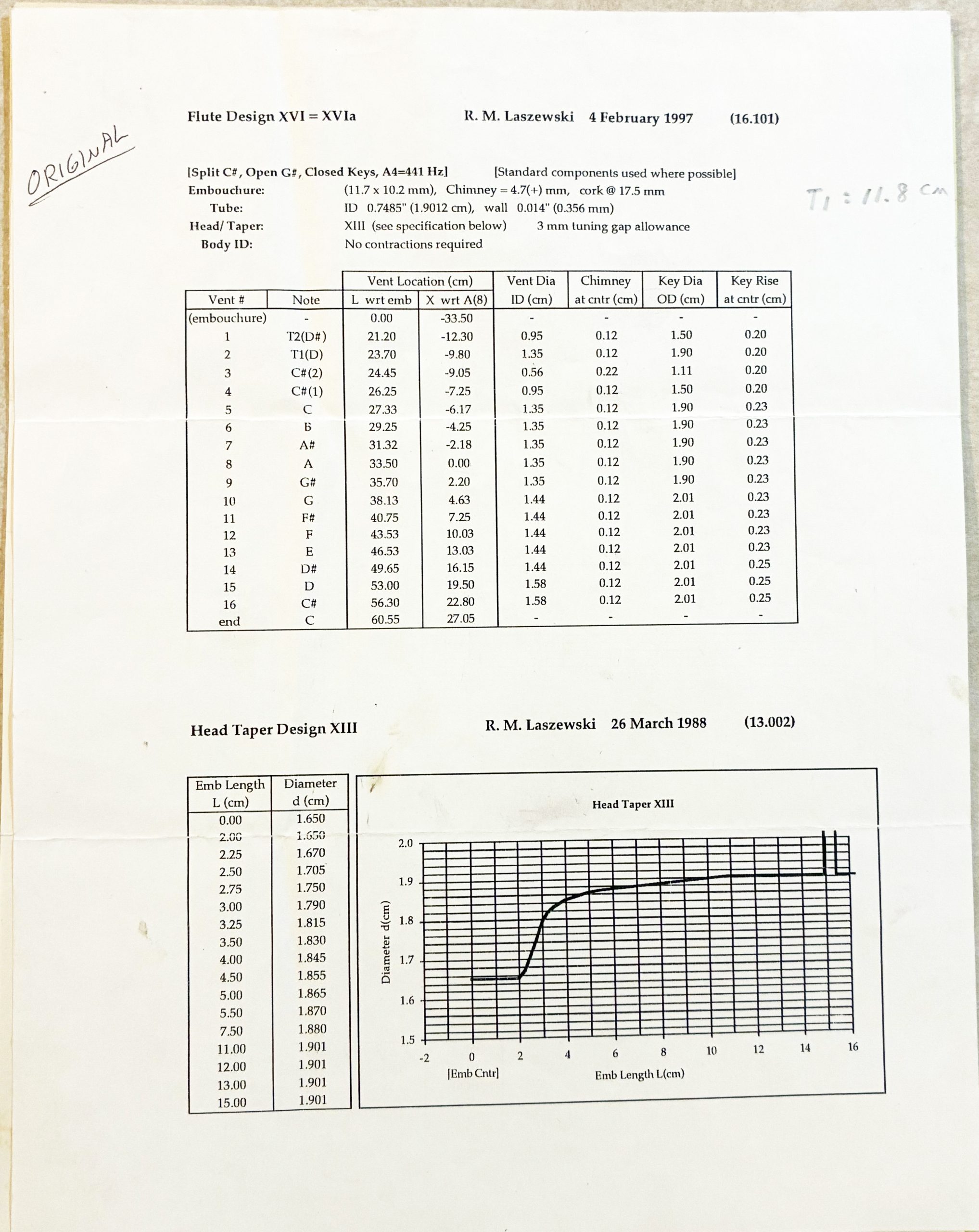 Tom Green recalls: “I remember when I went to Jack’s shop and we both looked in amazement at the dimensions of the Lasewski scale… We could not believe it would play. Comparing the placement of the tone holes, it was quite different from regular flute scales. Alex said it was to be matched with the head taper.
